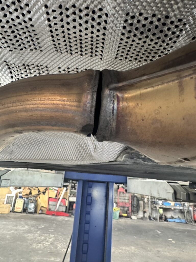 リフトアップして点検したところ、マフラーの溶接部付近が分離し、大きな隙間ができていることを確認いたしました。